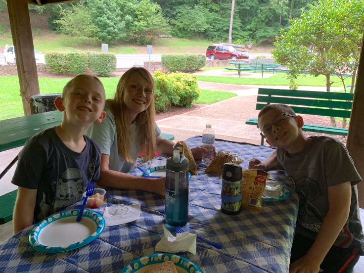 We always try to find a rest area or park to have a picnic for lunch. Gives us a break from the car and a chance for the boys to run around.