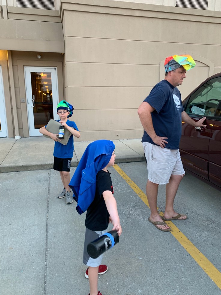 This is how the men in my life walked into and through the hotel. Yep, wearing each others’ swim trucks on their heads. Why? Who in the world knows. I’ve just learned to roll with it.