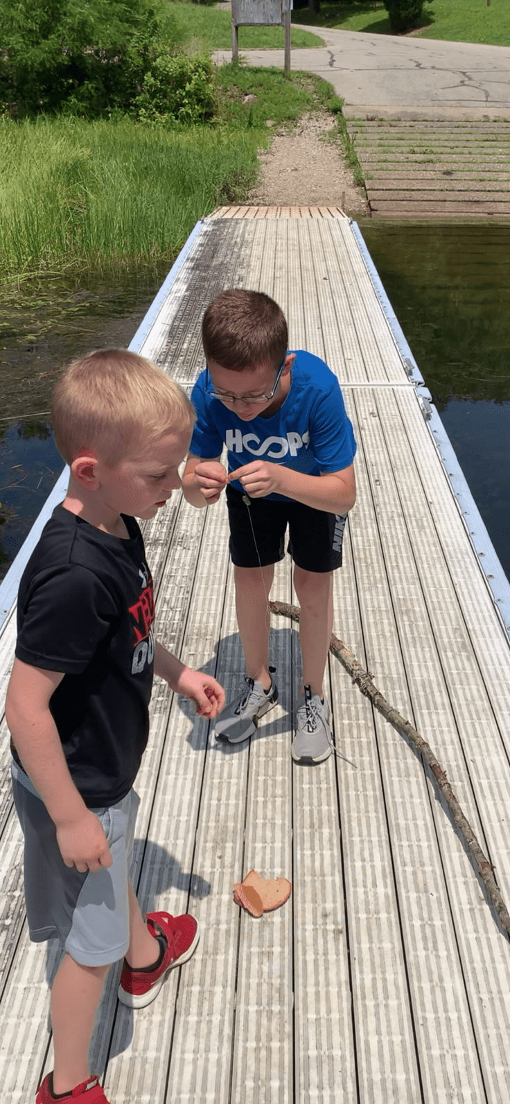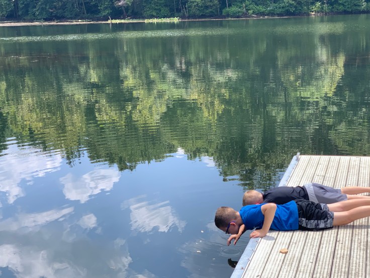 We were the only ones there. So we had lunch and then the boys saw a bunch of little blue gills and wanted to fish. We didn’t have room to pack fishing rods but that didn’t stop those two.