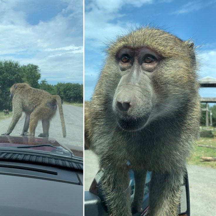 The drive through has different sections housing different animals that are able to cohabitat without eating one another. But within each section the animals roam around freely and can walk right up to your car, with just a few exceptions like the cheetahs and kangaroos and couple others that are fenced separately. Unlike Virgina Safari Park, you can’t feed the animals and you must keep your windows up since they have things like lions that could eat you. Or baboons that climb onto your car and perch on your side mirror. You can’t make this kind of stuff up. Yep, this little fella climbed up the front my car, walked around, perched himself on my side mirror, walked over to Trev’s mirror and licked his window, and then fell off. Holy smokes! The video I have of this with the boys in the background screaming with delight is hilarious! At that moment, the entry fee was well worth it for them, even if that had been the only thing they did or saw all day, I think.