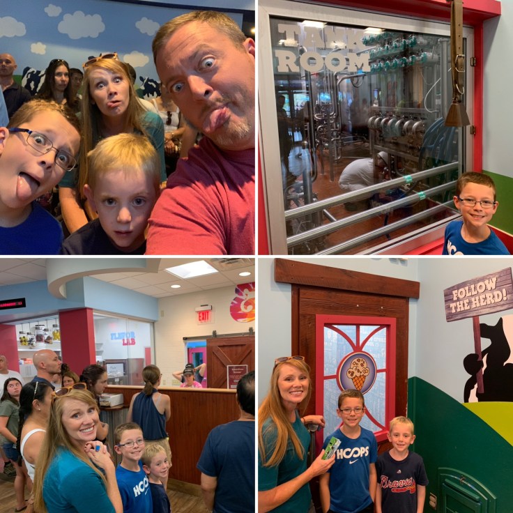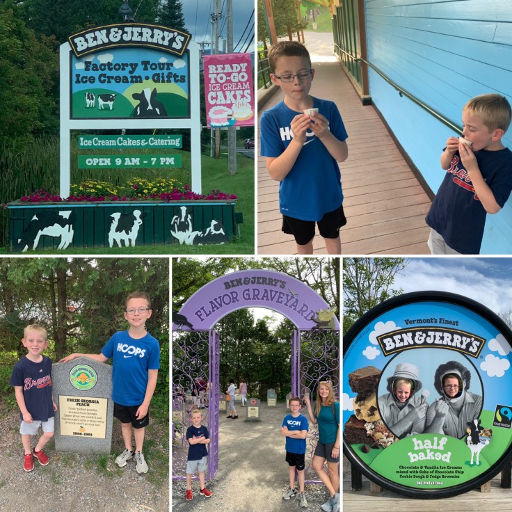We decided ice cream sounded like a good summer activity, so we headed over to The Ben and Jerry Ice Cream Store and Factory Tour. It was crazy busy when we got there. While we waited for our tour time, the boys got their pressed pennies and Trevor handled the phone call with the insurance company about the windshield. Adults are $4 but kids are free and you have specific tour times on your ticket. We were excited about seeing the operations, but when our group went through, they were cleaning the machines so no ice cream was being made. They had been making mint chocolate chip just prior. They are required to clean everything every 72 hours and whenever they change flavors. We had to watch another video instead. So that was kind of a bummer, but after the tour guide sent us downstairs for samples, everyone was all smiles and no one complained. They had AmeriCone Dream set out for us to sample. It’s was yummy.