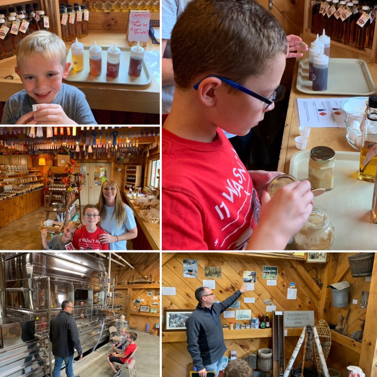 You can’t come to Vermont and not talk about maple syrup and you can’t talk about Vermont maple syrup without talking about the Goodrich’s. So to their farm we went. The Goodrich’s farm has about 120-125,000 maple trees on over 5,000 acres and the family has been making maple syrup for 9 generations. Although the syrup is made in late winter/early spring, they still have little tours that explain the process and equipment, etc. I had no idea that it takes about 44 gallons or so of maple sap to make 1 gallon of syrup. No wonder maple syrup is so expensive. There are also four color grades: Golden, Amber, Dark, and Very Dark. We were able to sample all four plus vanilla bean, blueberry, maple cream, and coffee. The boys also got a piece of maple candy. That stuff is SWEET! I took a tee-tiny nip, not a bite just a little scrapping of it, and it was sweet. Don’t worry Aunt Trishy (aka Dr. Hulsey), I went out and immediately bought the boys toothbrushes with built-in timers to hopefully help with brushing. Not even joking.