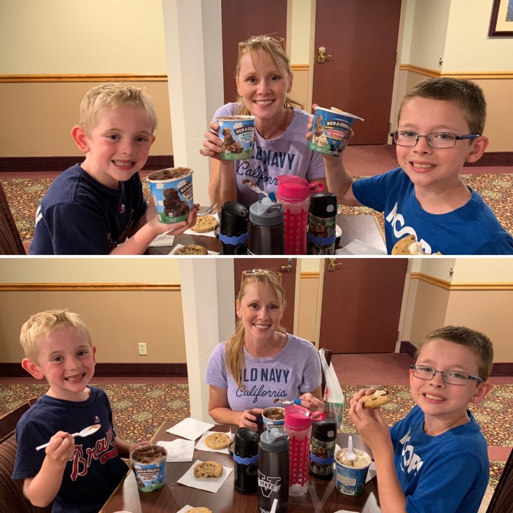 So how do you celebrate victory? A trip to the grocery store. No, well, yes. We needed a few items from the store but we promised the kids ice cream so we made good on our promise. The idea was for everyone to agree on a flavor and get a half gallon or preferably something smaller to share. Remember, all we have is a cooler. There is no keeping leftovers. Imagine my surprise when I turned the corner to find the Ben and Jerry’s was buy 2 get 2 free. Buy 2 Get 2!!! 2+2=4. There are 4 of us! We could each get our own flavors. Coincidence? I think not. So we each spent a painstaking five to seven minutes mulling over all the choices and making our final selections. Trev picked out Everything Bit The.., Tuck selected Chocolate Brownie Fudge, Mason got the AmeriCone Dream and I struggled between New York Super Chunk Fudge and Pistachio Pistachio. I have never tried Ben and Jerry’s Pistachio (only Moo Bears and it’s delish) but I knew I liked the NY so I played it safe and went with that. We went back to the hotel and gave ourselves tummy aches; especially when the fellas decided to eat the cookies the hotel puts out in the evenings with their ice cream. Total junk food but the boys thought it was awesome so I rolled with it.