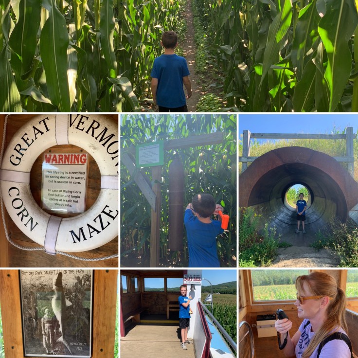 Then to the hotel for a good nights rest to prepare us for the ultimate epic largest cornmaze in New England, the Great Vermont Cornmaze. The boys wanted to separate and race parents vs kids but, for obvious reasons, we broke into parent/kid teams instead. Mason immediately chose me and Tuck got stuck with dear old dad. He’s a hoot to be around (way more fun than I am) but he’s a little directionally challenged. Remember Indiana?? Of course, this meant the “trash” talk began. The boys decided we needed team names and nicknames. Tuck wanted to be Corn Destroyer and Trevor was Corn Ball and together they were the Barnstormers. Mason wanted something corny, pun intended, so we were team A-maze-ing Duo and my name was Pop and his was Corn (Duo. Pop-Corn. You get it, right?) At that point it was on like a chicken bone!