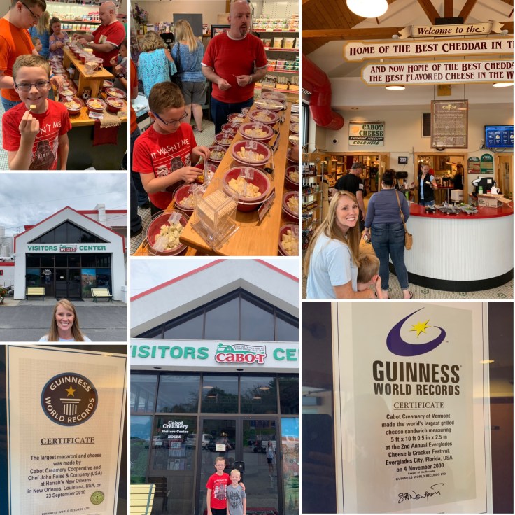 I wasn’t too worried because at our next stop, Cabot Cheese Visitor Center, they, well mostly Mason, filled up on cheese samples. They no longer give factory tours but they have a 10 minute video and a Q&A session along with a variety of cheese samples. Tuck didn’t love any. Mason liked them all but Hot Buffalo was his fave. Trev liked the Habanero and I really enjoyed the Tomato Basil. We had just been to the grocery store so I didn’t need any cheese but we did sample a Maple Zucchini Relish, which the three of us all, surprising, enjoyed so we purchased it and were off to our next stop.