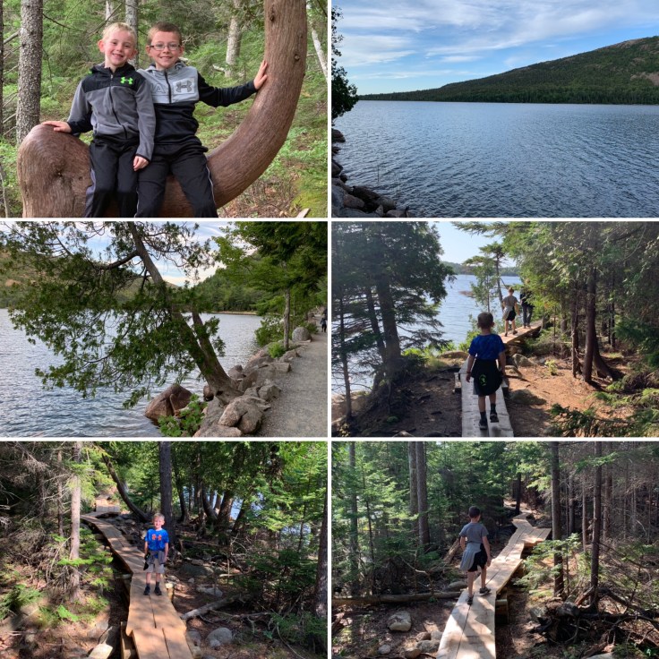 The parking lot was full by the time we left. I don’t know where everyone else went but we headed over to Jordan Pond. No one was over there so we had the trail all to ourselves. I usually carry some sort of backpack with water, snacks, first aid, etc but since we had just eaten our to-go bags and downed some water, and the trail was super easy I decided we would be fine without it. The path was a pleasant stroll around the pond.