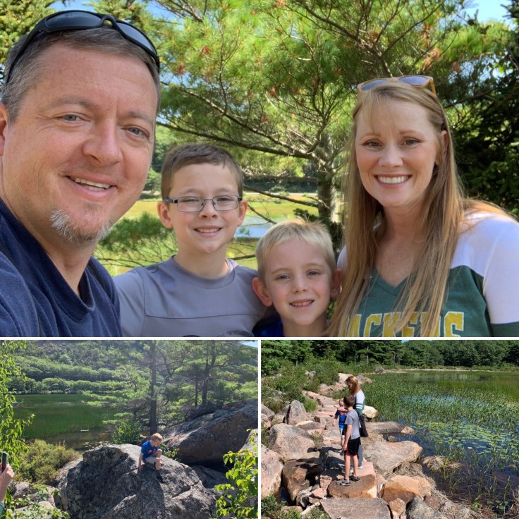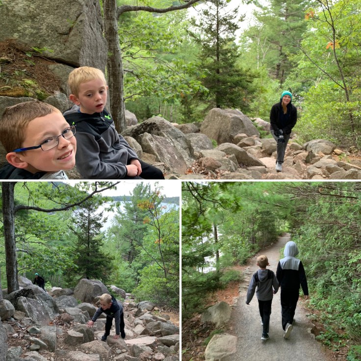 Our next stop was Bubble Rock. Lots of the trails in Acadia are connected. So while we were walking Jordan Pond path, we saw a sign for Bubble Rock (located on the South Bubble) and it was a short trail so we decided to hike it. What we didn’t realize was that it was straight up a pile of rocks. Remember, my boys love climbing rocks so that part was great.