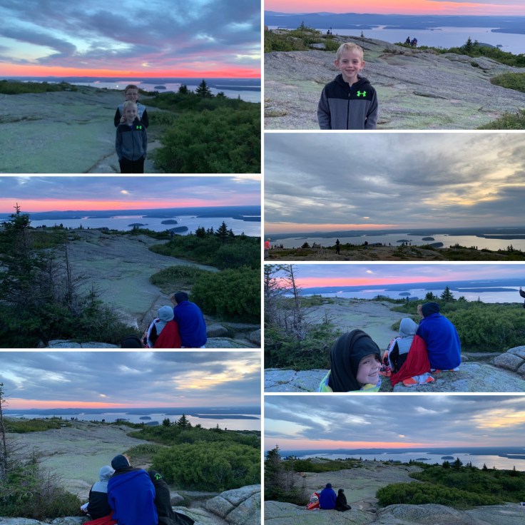 Everything I had read said that seeing sunrise on Cadillac Mountain was, almost, spiritual. But seeing sunrise meant getting up early, like 3am early. We asked the boys and they were up for the adventure so we packed the backpack the night before, grabbed breakfast-on-the-go bags from the hotel, set our alarm, and off to dreamland we went. Three am came quick but we were out the door and in the car by 3:39am. Not much traffic that early in the morning so we were to the top of the mountain around 4:25am. It was a little chilly so we sat in the car for a few minutes before finding our spot on the mountain.
