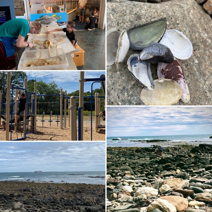 After the submarine, we headed over to Odiorne State Park to the Seacoast Science Center. It’s a hands on science center for kids. You have to pay to get into the park and then pay to get in the Center so we made sure and stayed awhile. We went to the Science Center first and the kids put together a dolphin skeleton using real dolphin bones, watched the seahorses get fed and listened to the seahorse talk, looked around at the small exhibits of marine life, stuck their hands in a touch tank, and watched a couple short videos about humpback whales. Then we left the center, had lunch, played on the playground, and then back to the Center for an outdoor naturalist talk and walk.