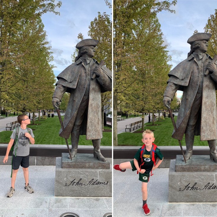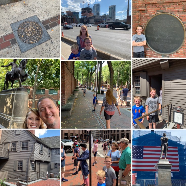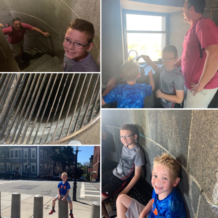 The boys learned lots along the Freedom Trail. The Freedom Trail consists of the following sites: Boston Commons (America’s oldest public park est. 1643), Massachusetts State House, Park Street Church (founded 1809), Granary Burying Ground (est 1660 burial grounds of several famous individuals such as Paul Revere, John Hancock, Samual Adams, and James Otis to name a few), King’s Chapel, and King’s Chapel Burying Ground (Boston’s first Anglican Church), Boston Latin School Site/Benjamin Franklin Statue (founded 1635 is the oldest public school in America), Old Corner Bookstore (constructed in 1718 its downtown Boston’s oldest commercial building and once home of the Ticknor and Fields publishing agent which produced Walden, Scarlett Letter, Midnight Ride of Paul Revere, etc, which is now a Chipotle), Old South Meeting Place (where the Boston Tea Party began), Old State House (built in 1713 it is the oldest surviving public building in Boston), Boston Massacre Site in 1770, Faneuil Hall (hosted America’s first Town Meeting), Paul Revere House (THE Paul Revere owned the house from 1770-1800),
