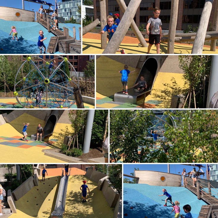 This park is called Martin’s Park. It is named after the 2013 Boston Marathon bombings youngest victim, 8-year-old Martin Richard. Martin’s whole family was there with his sister Jane, losing a leg, his dad, Bill, losing some of his hearing, his mom, Debra, losing sight in one eye, and his older brother, Henry, suffering no physical harm. The $15 million park just opened in June. Fundraising was set in motion years earlier and the Foundation has an endowment to keep the park maintained so its not a line item on the city’s budget that can be cut. Ironically, Martin had made a poster earlier in the school year reading – No more hurting people. Peace. Those words were copied onto a banner which now hangs along the fence entrance. Five cherry trees are planted in the park representing the five individuals who lost their lives in the bombing.
