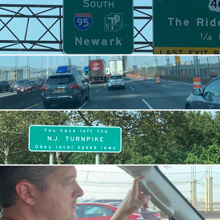Wrong bridge! Somehow, somewhere along the route either Google updated the route or somehow I changed it…but I didn’t. Why would I do that? So Trev is pretty ticked off at this point. To make matters worse the George Washington Bridge has a $7 toll for out-of-state plates that automatically gets mailed to you. $7 toll!! Mailed? We’re not anywhere near home. Man! Then to make matters even worse, as we are making a couple ring-around-the rosie-type turns, I tell Trevor he needs to stay right. It was a three way split and he stayed in the middle because he couldn’t get far right. The GPS updates just as we end up on Broadway (yes, that Broadway, in NYC driving with the cabbies Broadway) trying to find 172th or 178th (I can’t remember now). Heehee! I couldn’t help but laugh out loud. It was the one place he didn’t want to be- smack dab downtown (well, as someone from NY would probably point out, that’s technically not downtown-downtown like 34th street but trust me it was still way too much city) – and, yet, here we were. Trevor, on the other hand, was mad! Giving me the silent treatment kind of mad. Like I did it on purpose. Please! Then we had to get on the NJ Turnpike for another toll. Heehee. It was every place Trev had mentioned he didn’t want to be and WHAMO!; there we were. I told him at least we weren’t in the camper or headed down the Lincoln Tunnel. Heehee! Nope, too soon. It was way too soon for him to laugh about this.