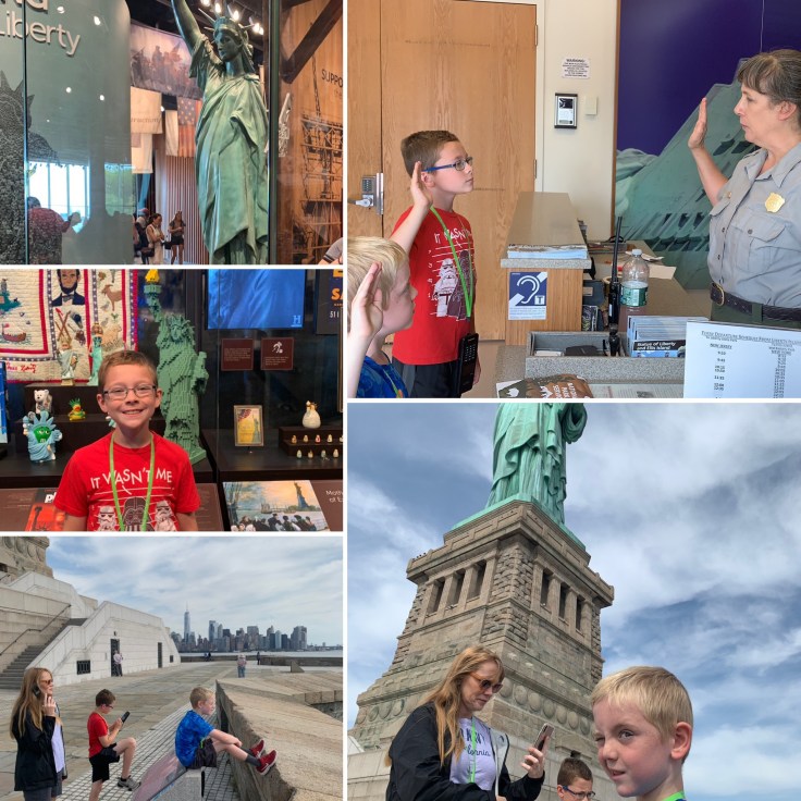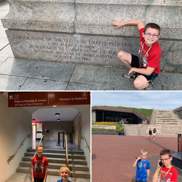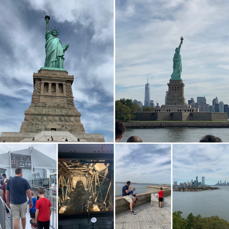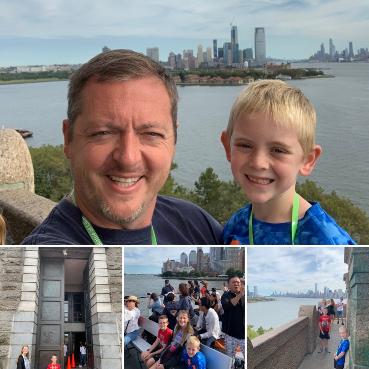 When you go over to the Island, tickets are &18.50/adult and $9/child for your Reserve ticket or Reserve Pedestal ticket. Reserve Crown tickets cost a few extra dollars a person. A Reserve ticket gets you to the Island but you don’t get to go up in the statue. You have to have a Pedestal or Crown ticket to go up in the statue as only a limited number of people are allowed to go up. We were able to get Reserved Pedestal tickets, which meant we could go up inside the pedestal but not further into the actually statue to the crown at the top. Reserved Crown tickets were all reserved until the middle of November. Bummer! There are lots of stairs. Everyone going to the island has to go through a security screening, then you have another screening if you go in the pedestal. You are very limited as to what you can take inside the Statue and if you are lucky enough to get Reserved Crown tickets then you really can’t bring much of anything (water, phone/camera, meds; that’s it). Be sure to check the National Park Service website for the exact info. I read lots of stuff about long lines and to get there early so we did. We were early and were allowed to board an earlier ferry since there wasn’t a long line at that point. I think it also helped that it was the first day of school for NYC. Just FYI, the northeastern states start back about a month later than the southern states. Less crowds and cheaper hotels once school starts back. 😉