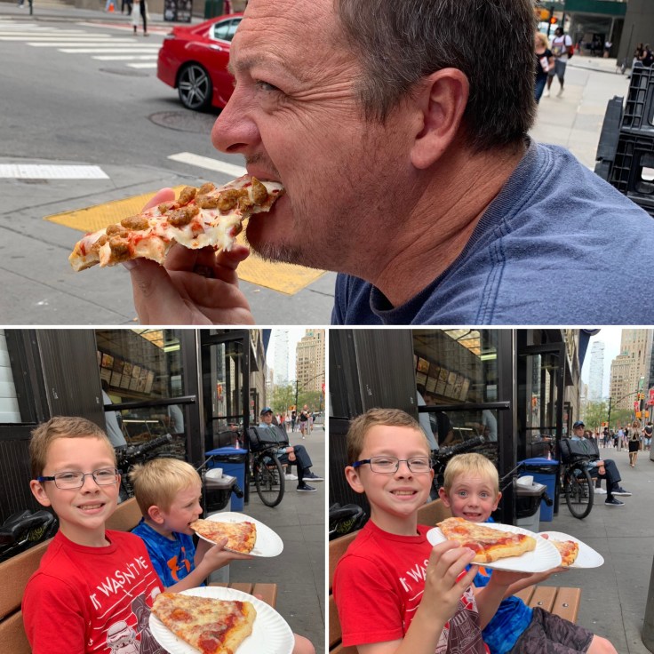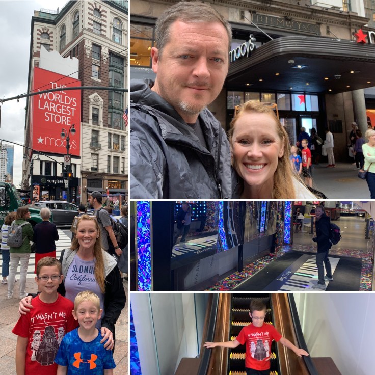 Instead of landing at the World Trade Center Oculus, we rode a little further up the 33rd Street stop. Today we were just walking around the city getting pictures at notable sites. First up, 34th Street for a picture in front of Macy’s. Some of you are thinking – what? I LOVE Christmas movies, remember. Now, does it make more sense? So Tucker saw the Macy’s sign that read – World’s Largest Store and declared he had to see it. My kids hate to shop so don’t ask me why he wanted to go in but I needed a potty and I figured they would have clean restrooms. Well, it was a a few minutes before the doors opened. So we waited and a crowd started gathering and getting bigger. They opened the outer doors and people pushed in but we were only allowed into the inner doors. They finally open the doors for what we found out was a 48 hour sale and we were greeted by loud music, employees lining the entrance singing and clapping, as the smell of various perfumes whaffed through our noses. Then we had to go downstairs to opposing corners of that floor to get to the men and women’s bathrooms. At this point, our potty break was turning into a an hour long stop and Mason and Trevor were ready to leave the City and it was only 10 something. Tuck on the other hand was loving the store with its high energy.