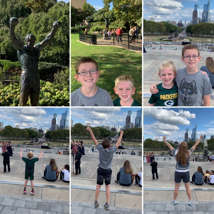 That’s right. These are the steps Rocky Balboa run during his training for his boxing match. It was hilarious! Everyone was running up the steps and victory jumping at the top. Of course, we have video of the boys running the steps and doing the victory dance. The line to have your picture taken with the Rocky statue was extremely long so we just opted to take the boys picture from the fence.
