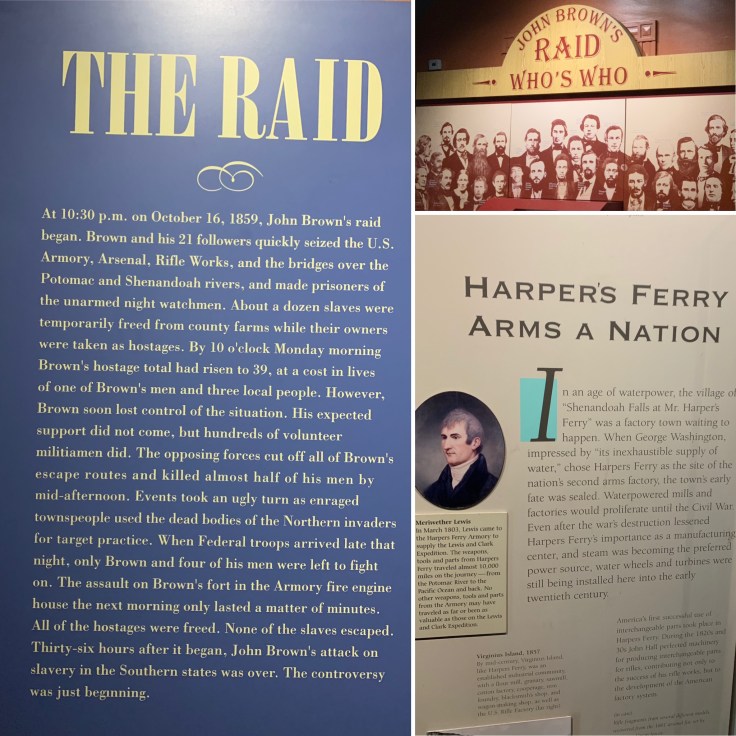 The US had an armory there and in an attempt to stop slavery, John Brown and his men raided the armory. The history of this event is intriguing and sad. Mr. Brown’s hopes were that they would steal the weapons, take some hostages, set some slaves free hoping in return they would join the fight for their freedom, and that would lead to the start of the end of slavery in our country. In the end, many were killed, the hostages were freed, the slaves feared retaliation if the fight was lost and decided not to fight, the military was called in, and Mr. Brown was hanged for his crime.