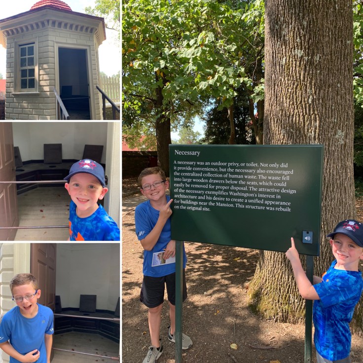 Our tour guide told us to check out the necessary for a surprise. We probably would have missed the privy if she hadn’t mentioned it. Once the boys read the sign and found the surprise of three potties side by side, they were cracking up.