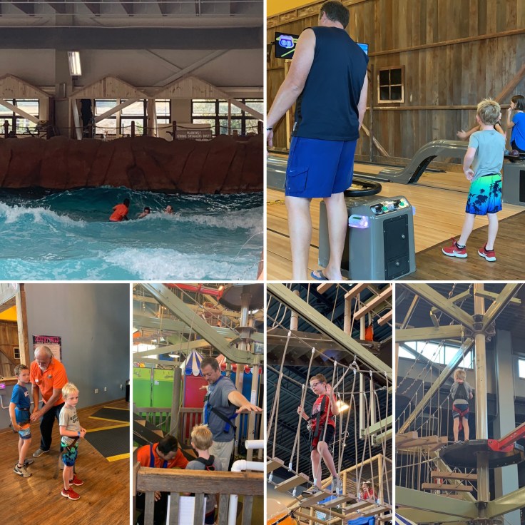 The next day we stayed dry in the Adventure Zone at Wilderness, with putt putt, laser maze, mini bowling, rock wall climbing, and a ropes course.