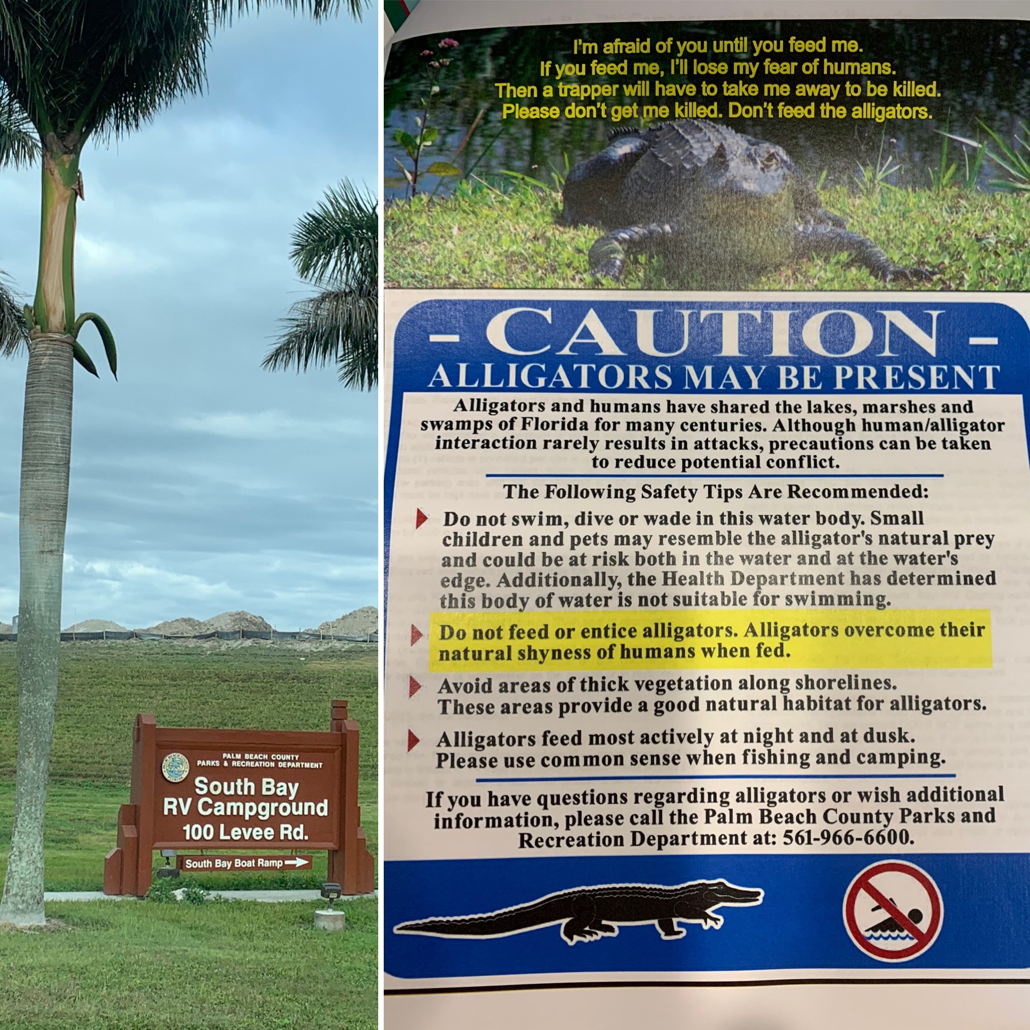 Wanna know how you know when you’re a few hours south of the heart of Florida? You start seeing alligators in the water; in retention ponds, drainage ditches, campground ponds, etc. We moved down to South Bay RV Park ran by Palm Beach County for a quick overnight stop on our way to our next destination. This paper was inside our check in info.