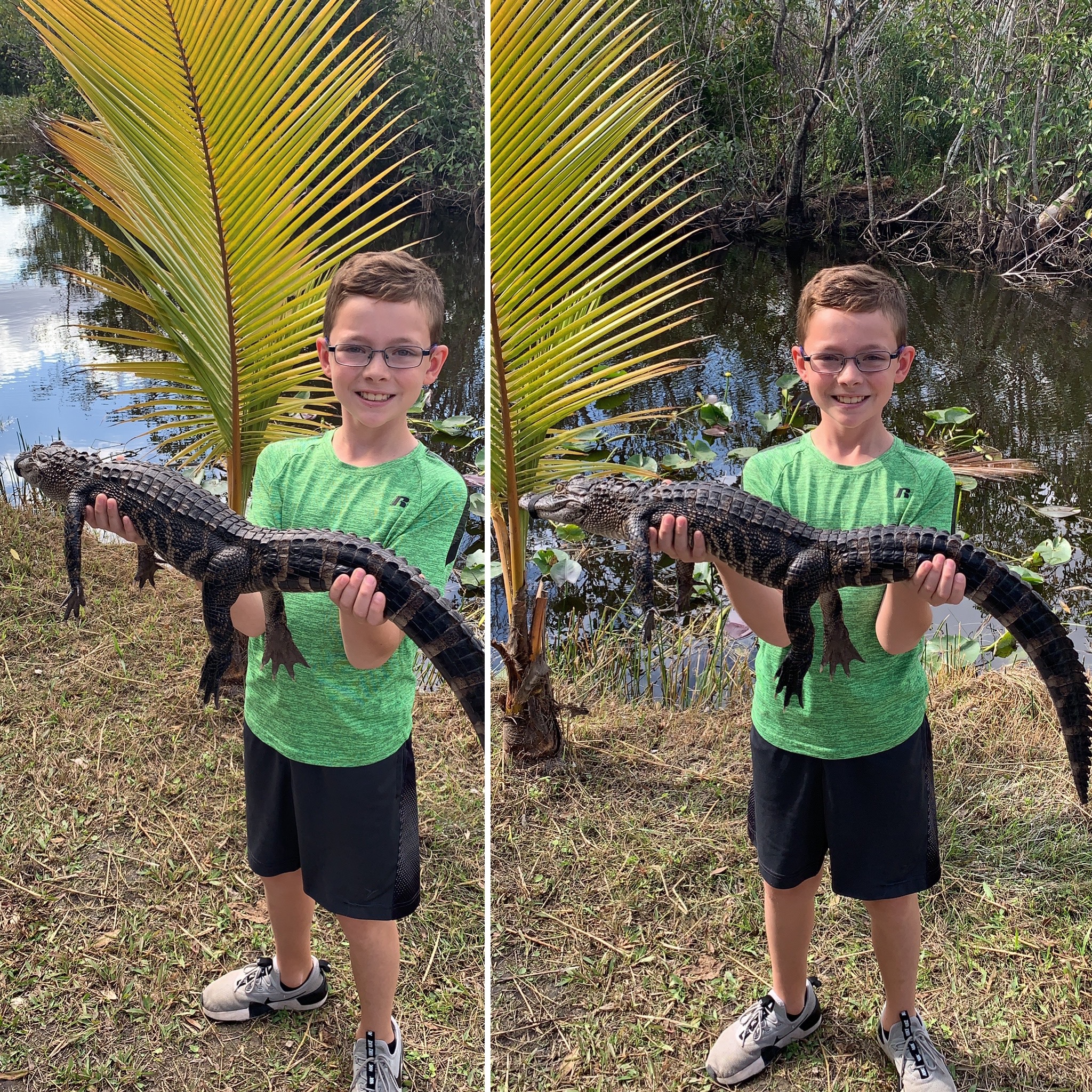 Later for dinner, Mason tried some grilled gator and a plantain from the Everglades Gator Grill. He liked the gator; plantain not so much. Tuck refused to try. Whose’s shocked? Anyone?