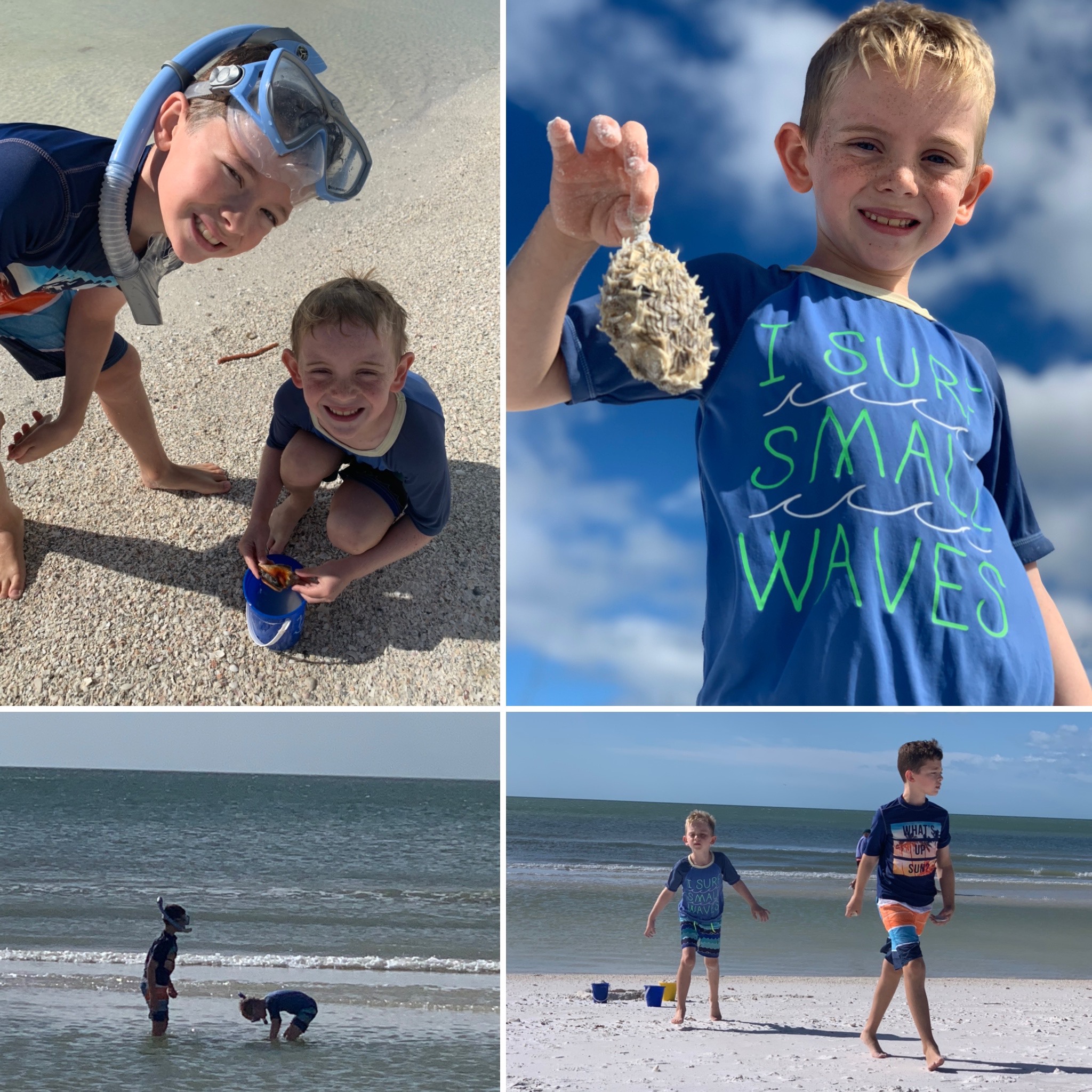 It was a smart decision. Once on the other side, you’re on the beach at Sand Dollar Spit on the Gulf of Mexico. The beach has sugary white sand with a TON of shells. The boys found a dozen or more sand dollars and conch shells along with a puffer fish. The boys had a great day collecting shells and playing in the shallow water. It was a fun way to celebrate the start of Christmas break. Tuck was excited school was over until January.