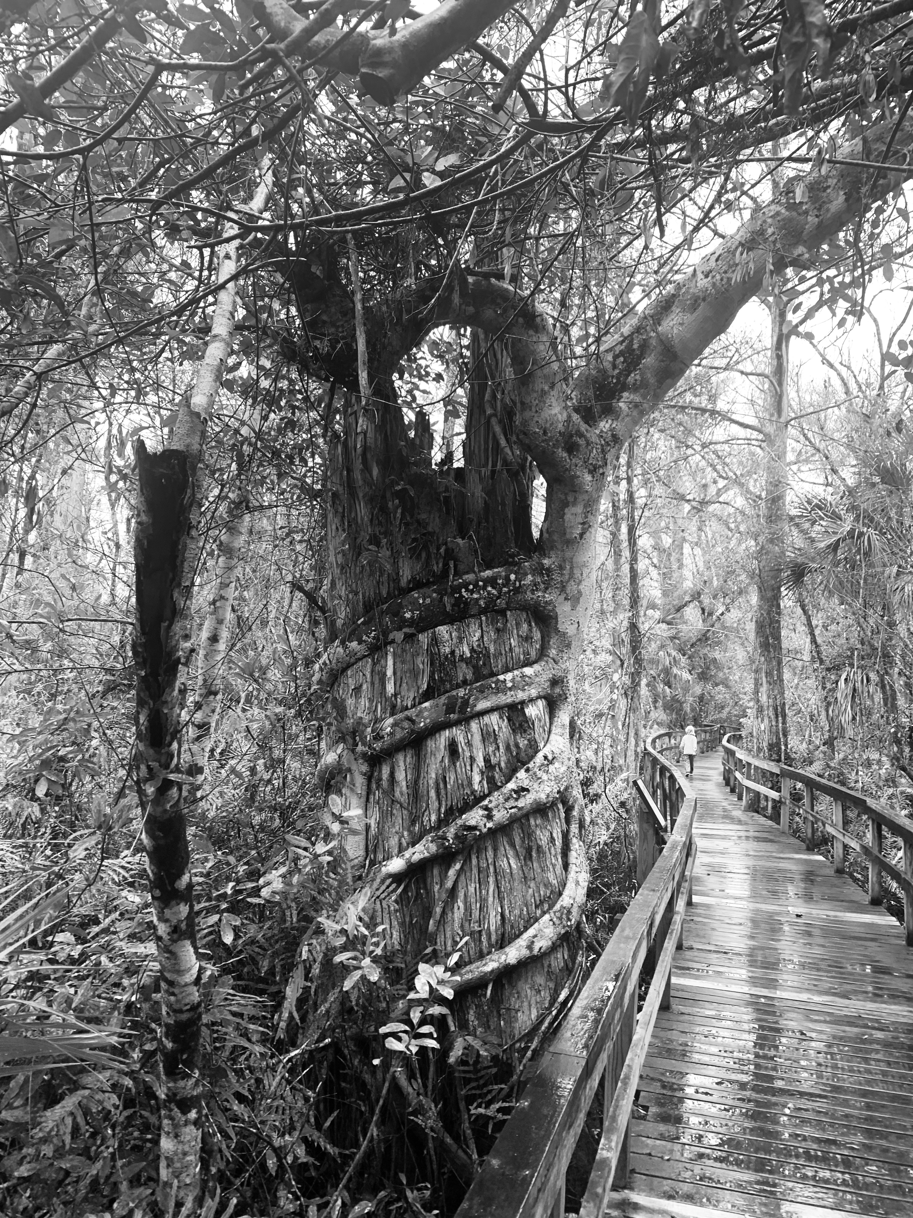 This Strangler Fig has this Cypress tree in its grasp. It looks like it’s reaching down and grabbing it so I had to black and white the picture to add to the spooky affect.
