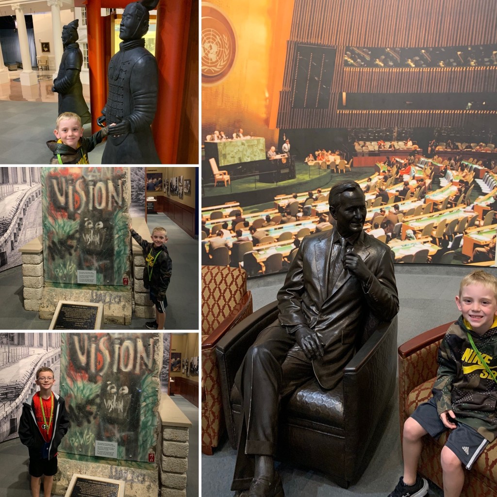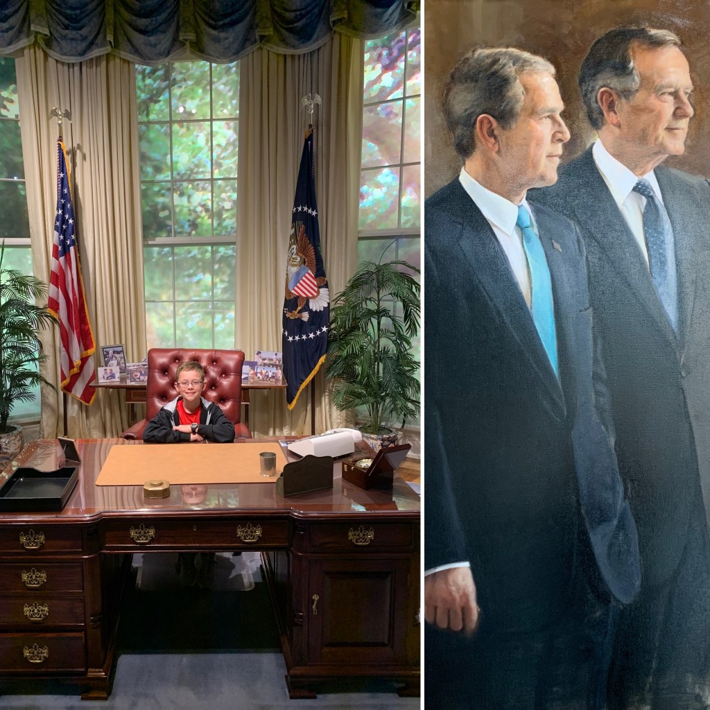 This portrait of him and W is one of my favorite portraits in the whole museum. There was just something sweet about it. Maybe it made me miss my dad, I don’t know, but I just kept staring at it. The picture on the left is my kiddo sitting behind the president’s desk in the replicia of the Oval Office. Who knows, maybe one day?