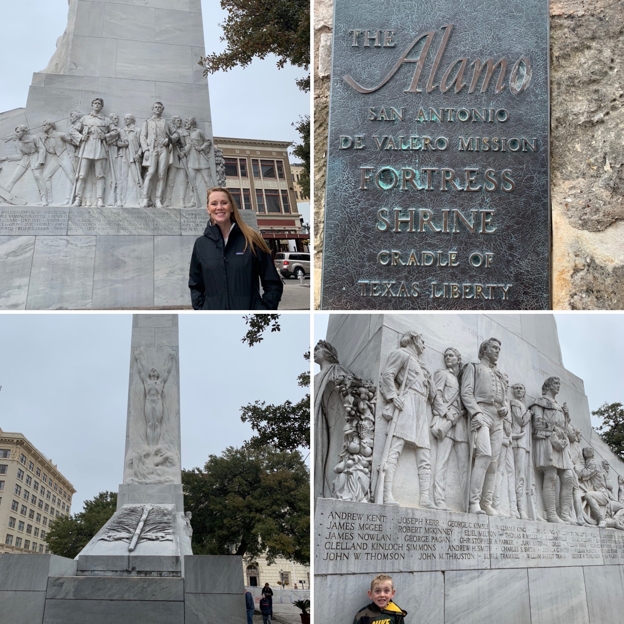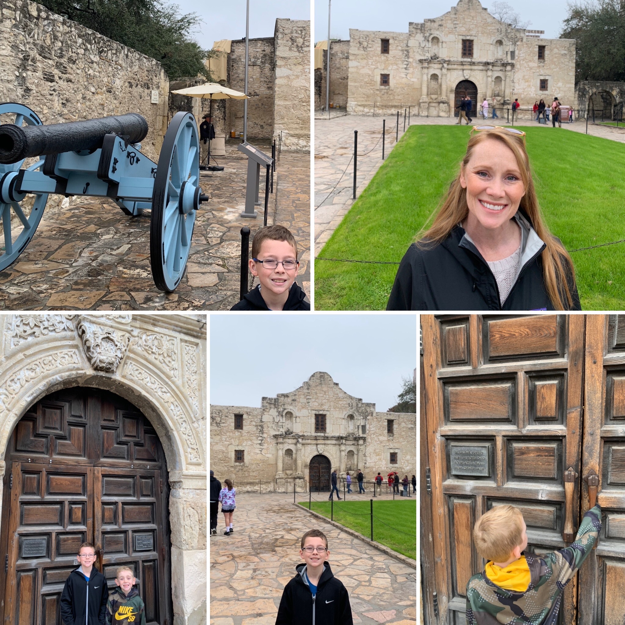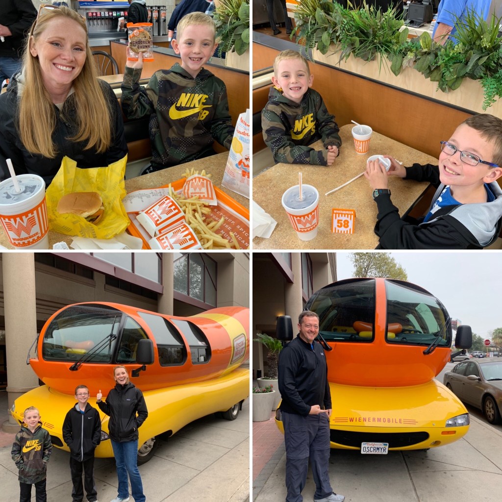 Of course, we had to see the Alamo. We walked from our hotel downtown. While out walking we saw the Oscar Mayer Wienermobile and had to get our pic with it. (Afterwards we had lunch on the road at Whataburger. It was a first for the boys. It’s the small things. This pic is out of order as it happened AFTER the Alamo but I didn’t want to redo the collage. Sorry.)
