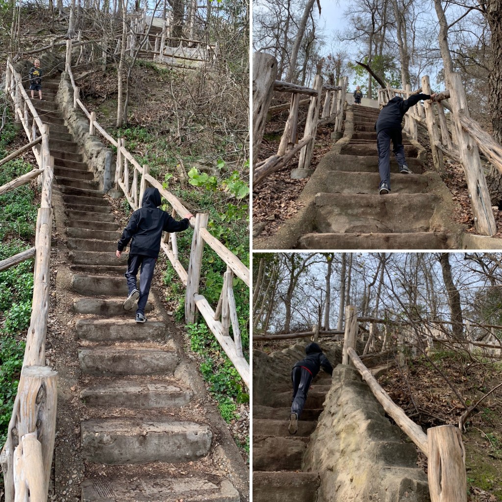 At the top is the clubhouse and another playground. We stopped and let the boys (all three of them) play. They like to make up obstacle courses and time each other.