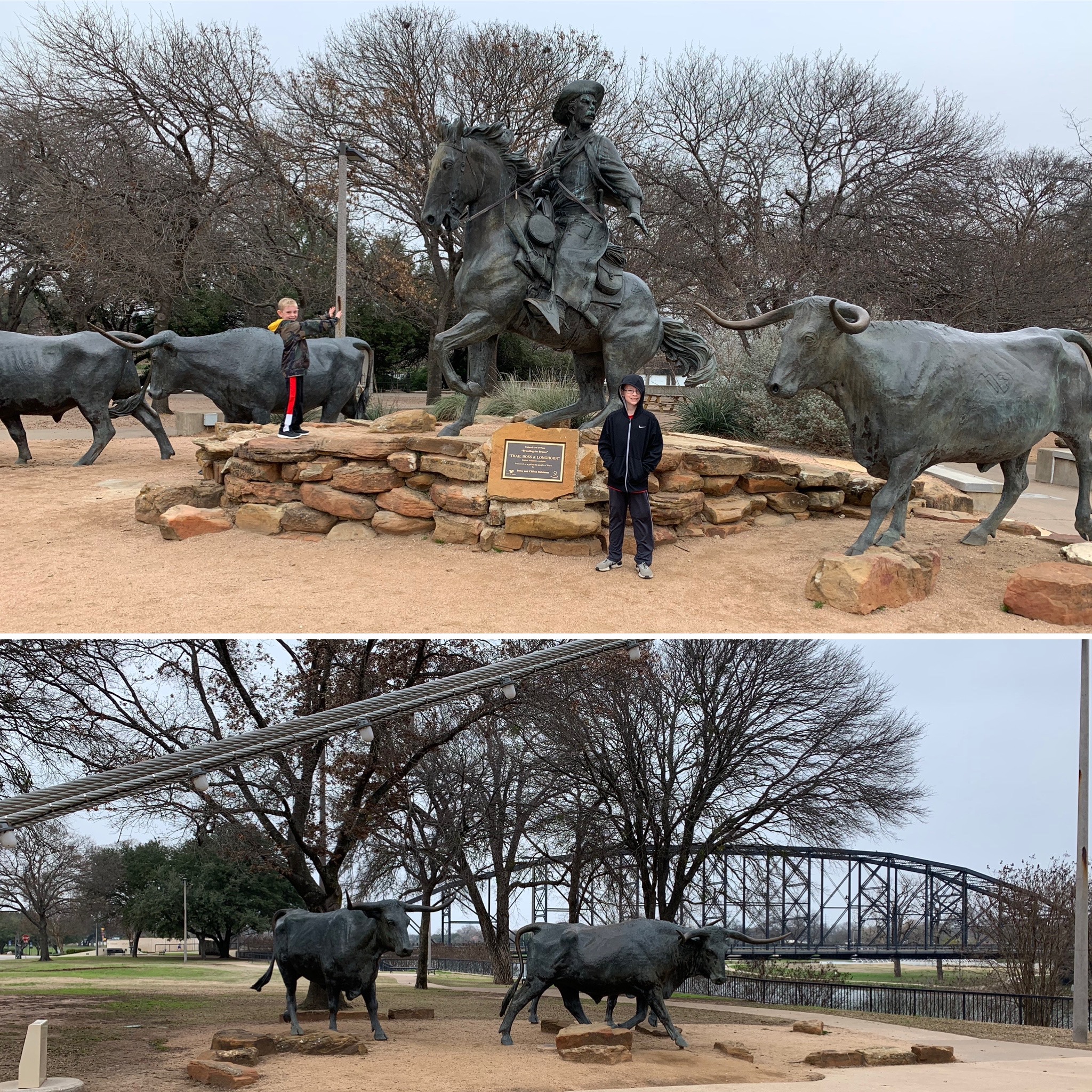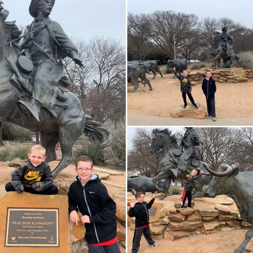 And then we snapped some pictures at the Branding the Brazso statue. This statue costs $1.65 million dollars (largely funded by a local businessman) and took eight years to complete. The statue pays homage to Waco’s days as being a stop on the Chisholm Trail’s cattle drives back in the 1800s. It is comprised of three cowboys (one white, one black, and one Hispanic) driving 25 heads of cattle.