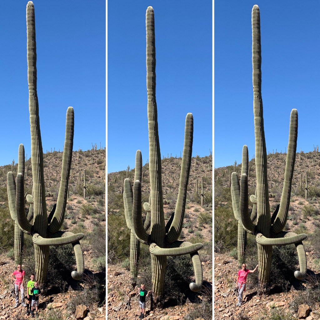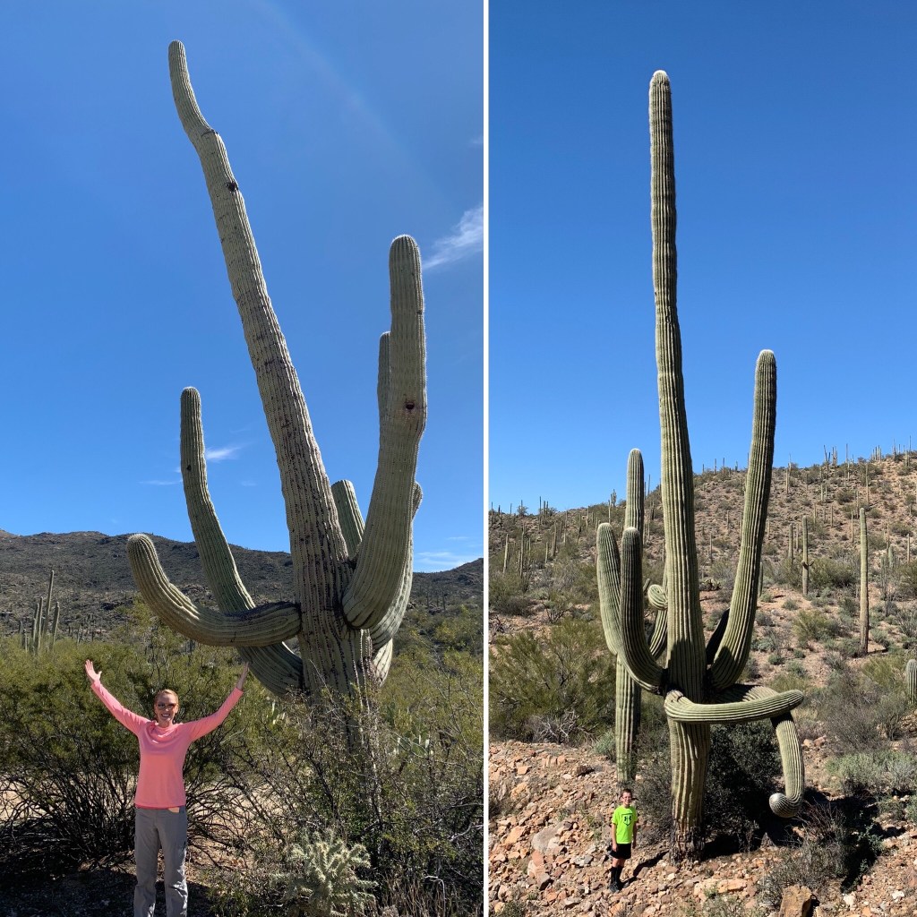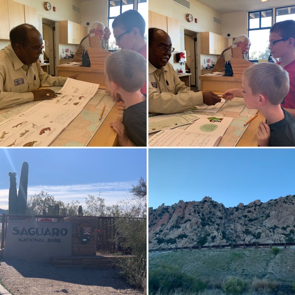 So we made it to Tucson in order to visit Saguaro National Park. It is named for the saguaro (sa-wah-ro or suh-wahr-oh) cactus that grows here. These are the really big cacti with the “arms.” These babies are HUGE! The park websites states that “the largest ever recorded was 78 ft tall but fell down in 1986. Currently, a saguaro in Scottsdale, AZ holds the title at 53 ft tall.” They can weight more than a ton! So we went to check them out. Both boys completed the Jr Ranger Program.