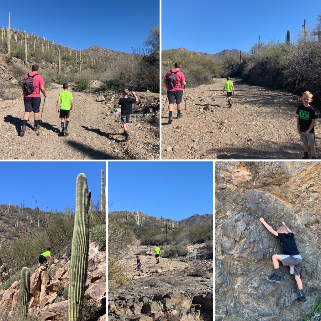 The next day we decided to explore Saguaro West. Knowing that the boys like to scramble over the rocks, the ranger recommended the King Canyon Wash trail. And scramble they did.