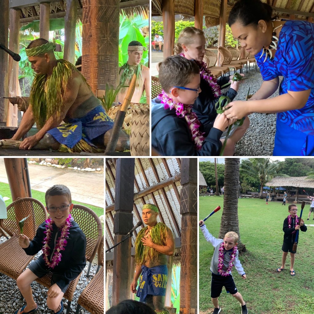 The first village we visited was Samoa. The cultural presentation was funny and entertaining. Afterwards, the boys got to play with the fire sticks, learned how to start a fire, weave a fish from coconut leaves, and watched a man climb a coconut tree.