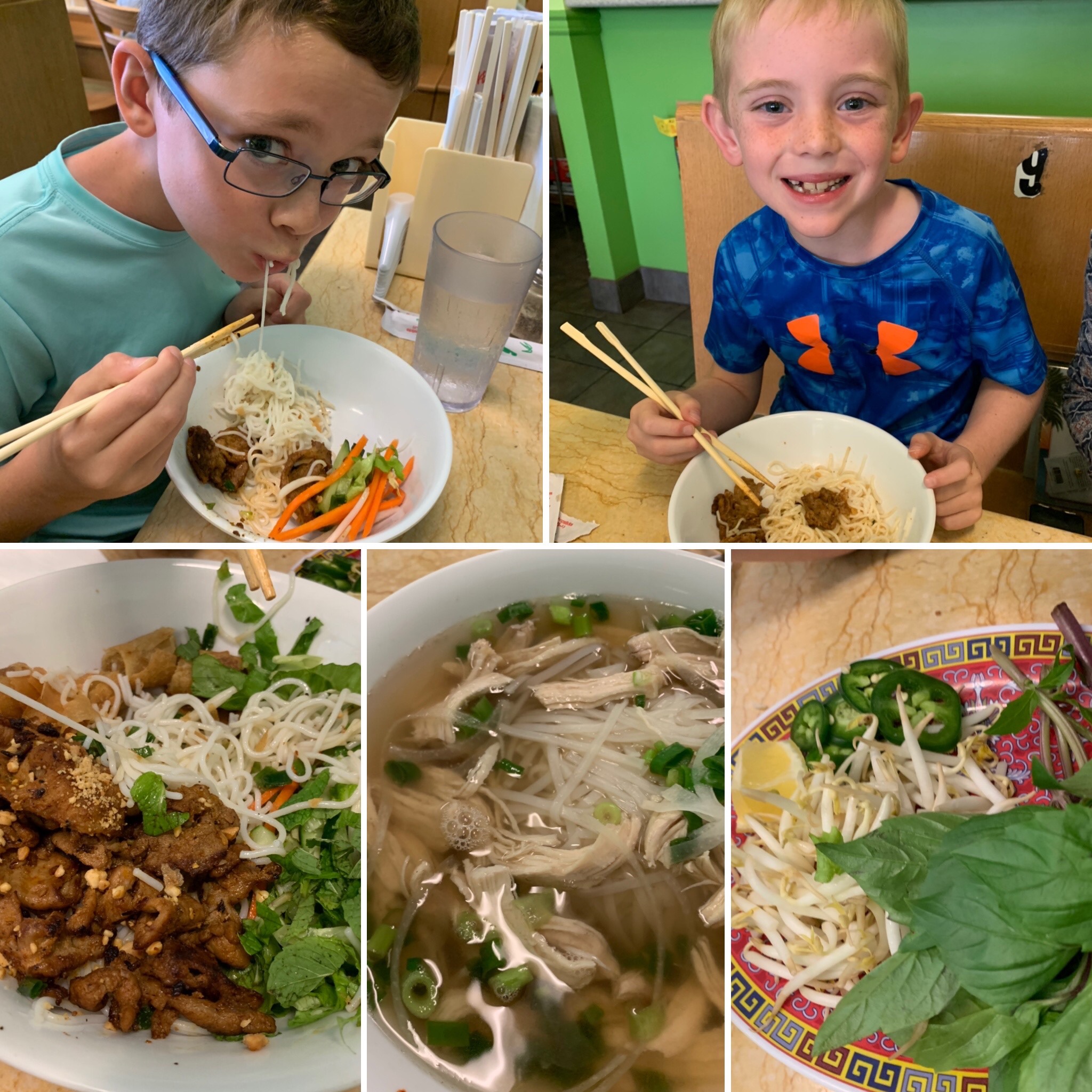 The kids love using chopsticks. They have even been using them at breakfast. Like I mentioned, with the heavy Asian presence, they serve things like miso soup and rice and salad for breakfast at the hotel. The boys have been getting rice every morning with breakfast. They didn’t like the miso with tofu. Anyway back to the Vietnamese place, the boys liked the pork dish so well, we had to order them another one.
