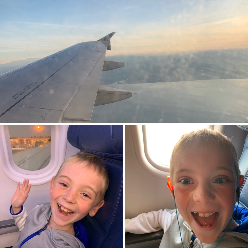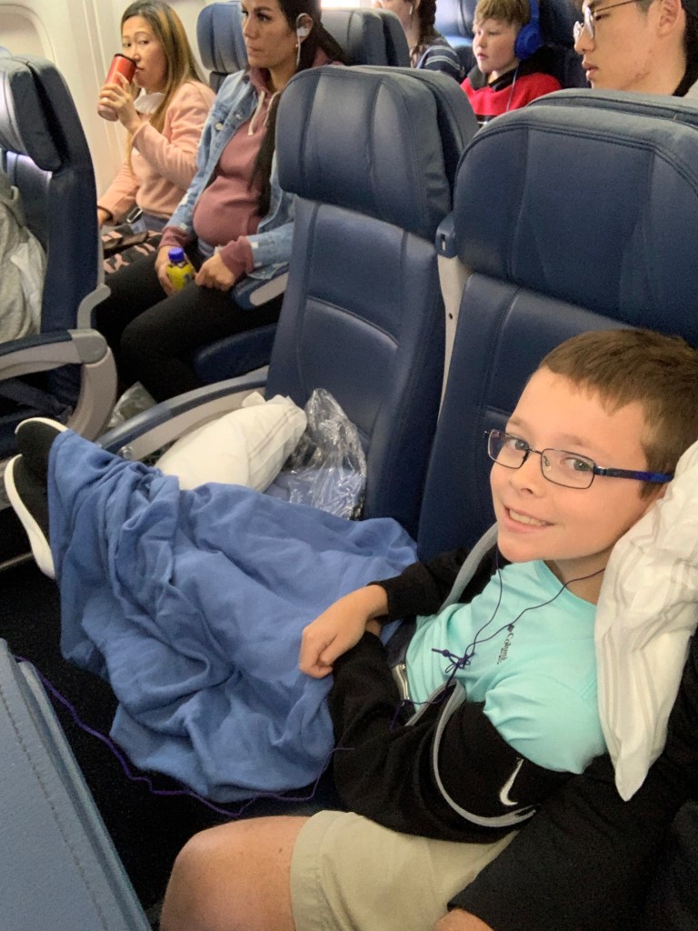 Trev and Mason ended up having an extra seat on their row. So they got to spread out for the long flight. Lucky ducks. I was glad, though. I always feel bad for Trevor on flights because he’s so tall.