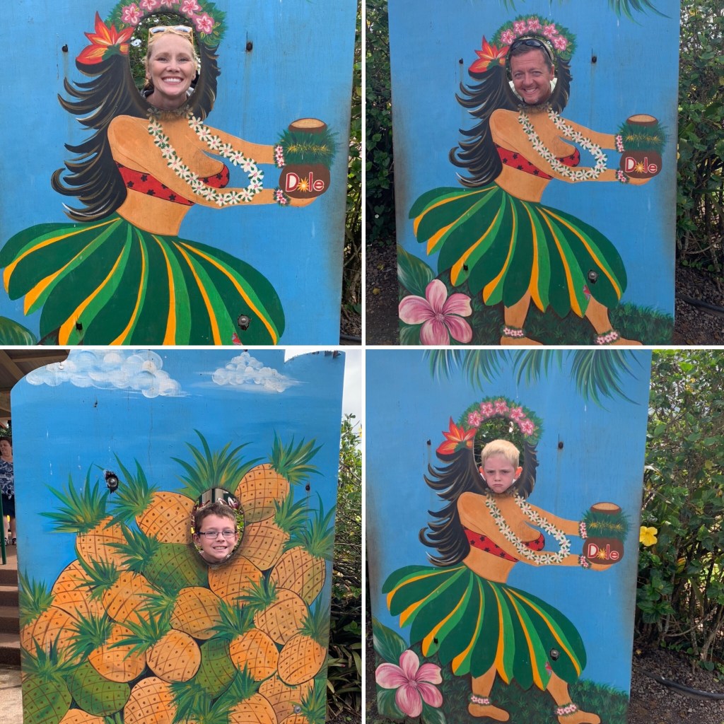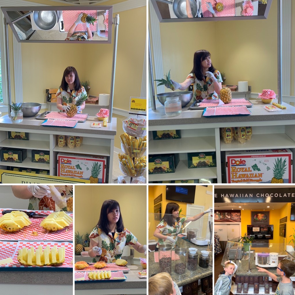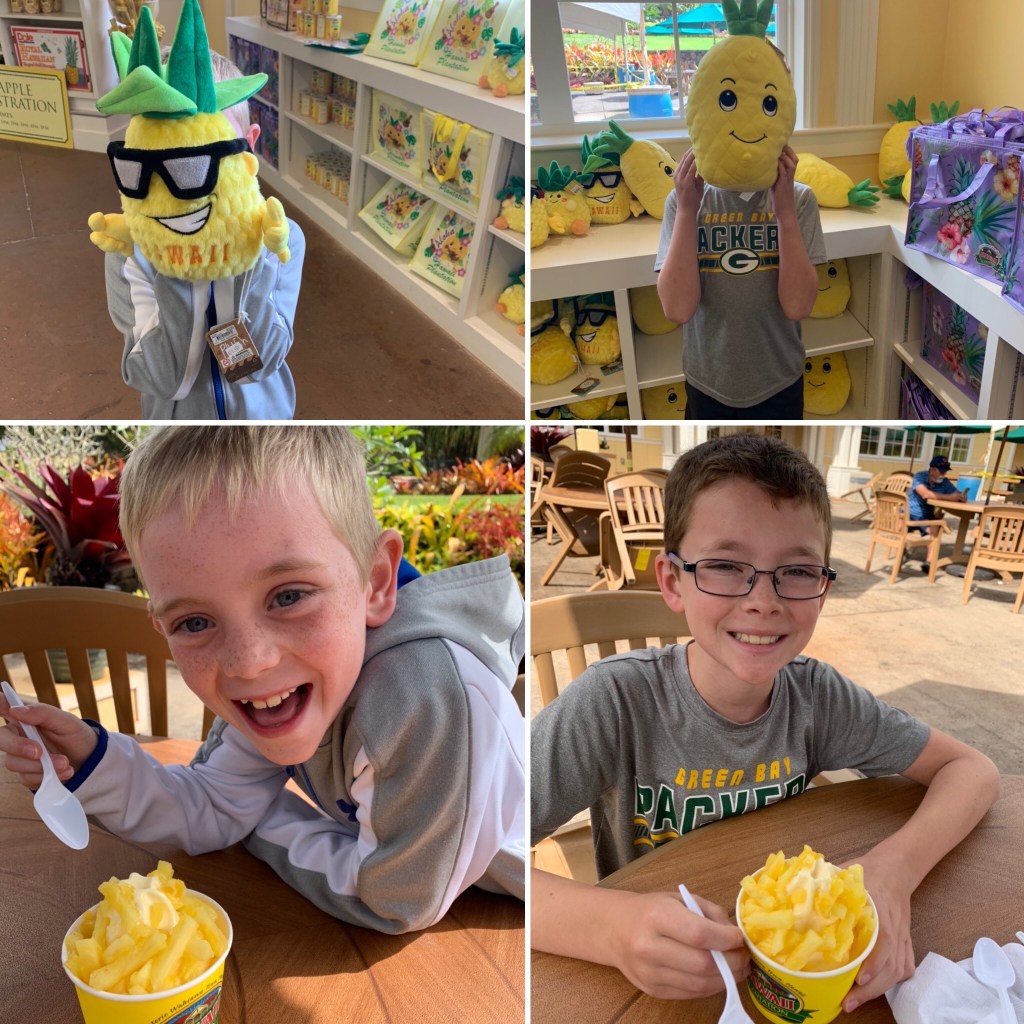 Next order of business, we had to try a Dole whip. I’ve heard people talk about these at Disney but I figure the best place to get one is at the source, right? All I can say is it tastes like pineapple. Then the boys found their favorite pineapple head as we waited for a pineapple cutting demonstration.