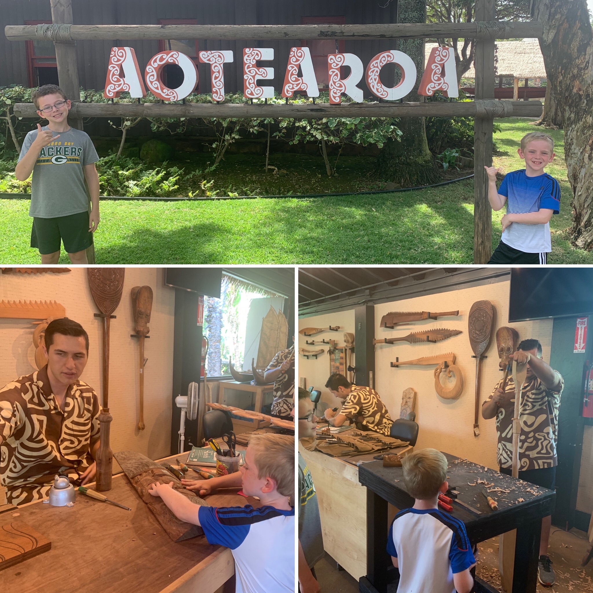 Then we visited the Aotearoa (New Zealand) village. We watched two men carve a canoe paddle and an ornamental piece and we made our own fish hook necklaces.