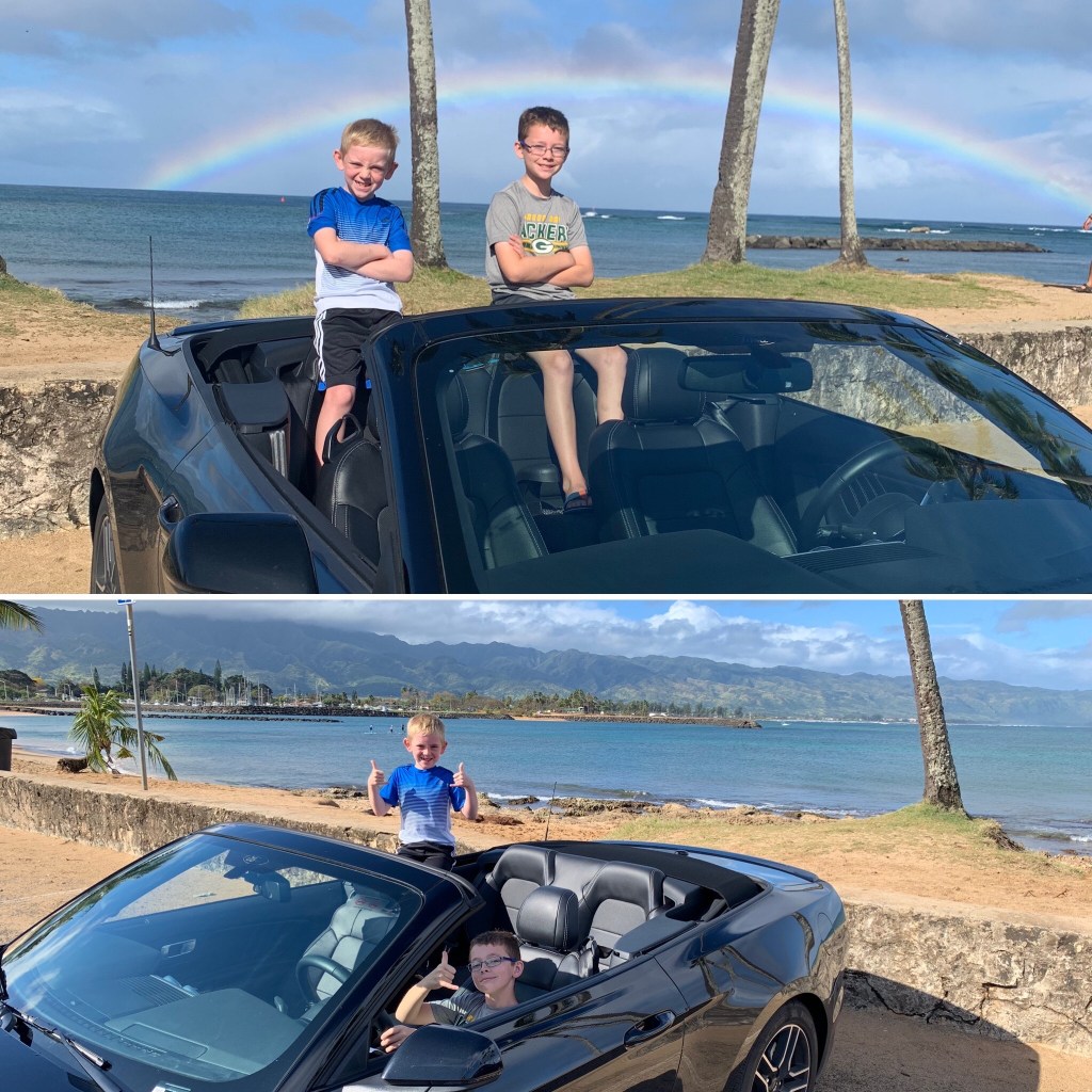 We thought the boys would get a kick out of driving around in a convertible so we spent the extra money and got a Mustang instead of a cheaper little compact. The boys were excited to say the least. Check out the rainbow in the background. How awesome is that?
