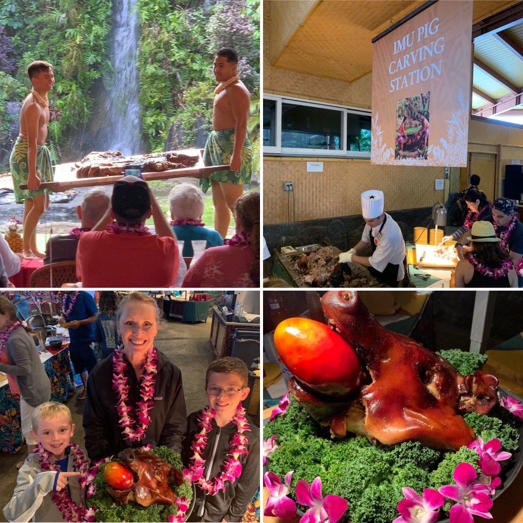 After we were seated, it was time for the Imu (underground oven) Pig presentation. We watched them get the pig out of the ground (I was taking video instead of pictures of that process), uncover it, and carve it up. I even got to hold the pig head. Awesome! I don’t know how many requests they get for that but there wasn’t a line.