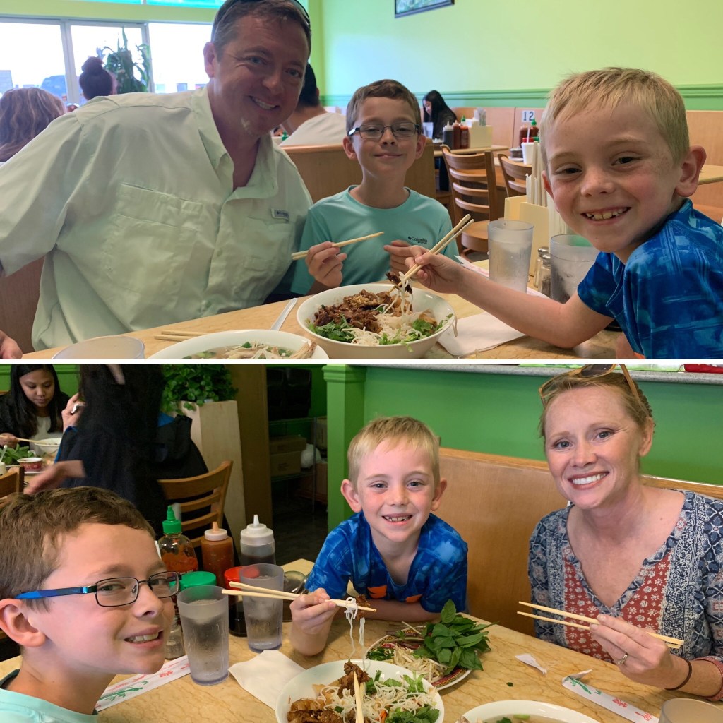 Mason’s second pick was to Stadium Pho for some Vietnamese. I guess being in the Pacific Ocean made him crave Asian food. A little pho with chicken and some barbecue pork vermicelli with spring rolls, bean sprouts, and mint. It was very good. Tuck even tried it and liked it. Makes me think of the old Life cereal commercial…He likes it, He really, really likes it! Man alive, I am really dating myself in these last few posts.