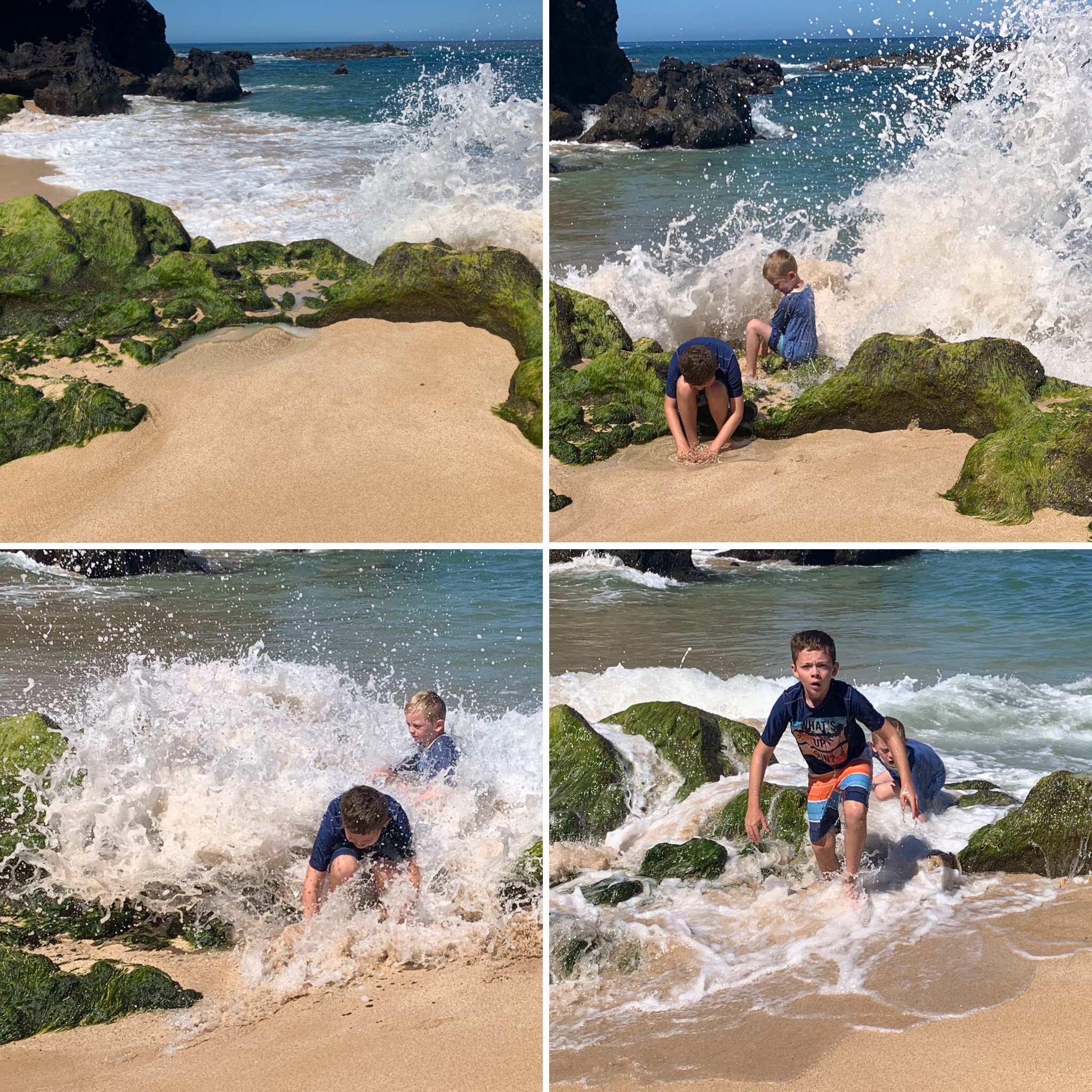 Ok, so don’t call DFACS, but I set the kids up. I asked them to sit on these pretty green covered rocks for a picture. So they waited patiently for me to get my picture. Little did the boys know, I had been watching the waves pour over those rocks. When the wave came in, Mason did not find it funny. Look at his face. He’s kind of wound tight like me. They would have thought it was funny if it had been me, though.