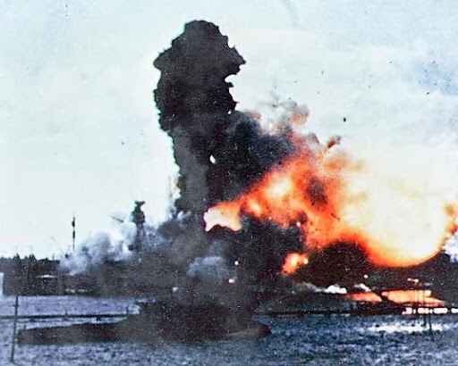 After the video, you take a very short boat ride, compliments of the US Navy, out to the USS Arizona Memorial. Battleships were named after states. The history of this day and this war is so interesting. Seriously. Summing it up really minimizes its impact and does it no justice. But for brevity, the USS Arizona was hit by the Japanese, violently exploded, and sank, taking with it the lives of 1,177 officers and crewmen. (The image of the USS Arizona explosion below is from an unknown photographer; National register of Historic Places reference number is 89001083.)