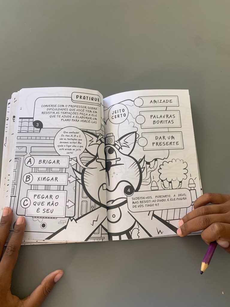 The kids are learning about Jesus being tempted by Satan, how Satan tempts us today, and how we should make wise choices. On this particular page, the kids had to decide what the right (certo) choice was instead of the wrong actions of A) fighting, B) swearing, and C) stealing.
