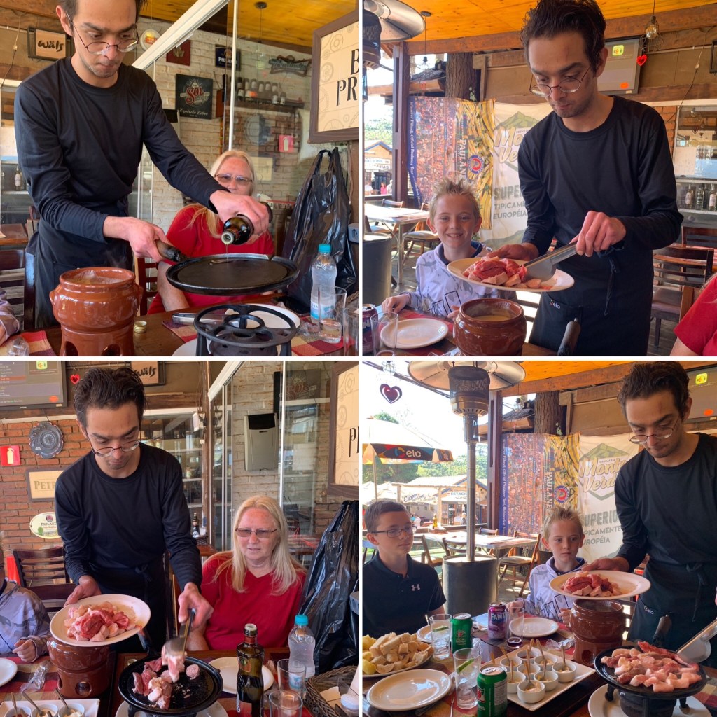 After chocolate watching, we were ready for lunch. So we chose a fondue rodízio restaurant. Remember, rodízio is the Brazilian word for an all you can eat style restaurant where the waiter comes by with a continual offering of food. We chose a restaurant that included chocolate with the meat and cheese. Of course we did.