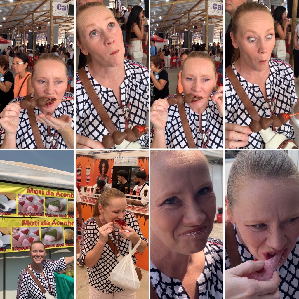 The rest of the treats we tasted were delicious. There was strawberry ice cream, chocolate covered strawberries, strawberry mousse parfait, strawberry juice, a strawberry tart, some coconut candy, and nêsperas, also known as Brazilian loquats, this fruit is native to Japan and China and kind of made me think of a small mild peachy type fruit. By that point, we had had WAY more than our fill of sweets.