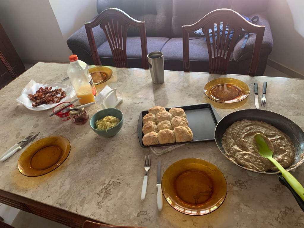 In honor of English camp, I made an American breakfast. It was the first time in seven and half months since we had biscuits and gravy. Everyone was excited about this.