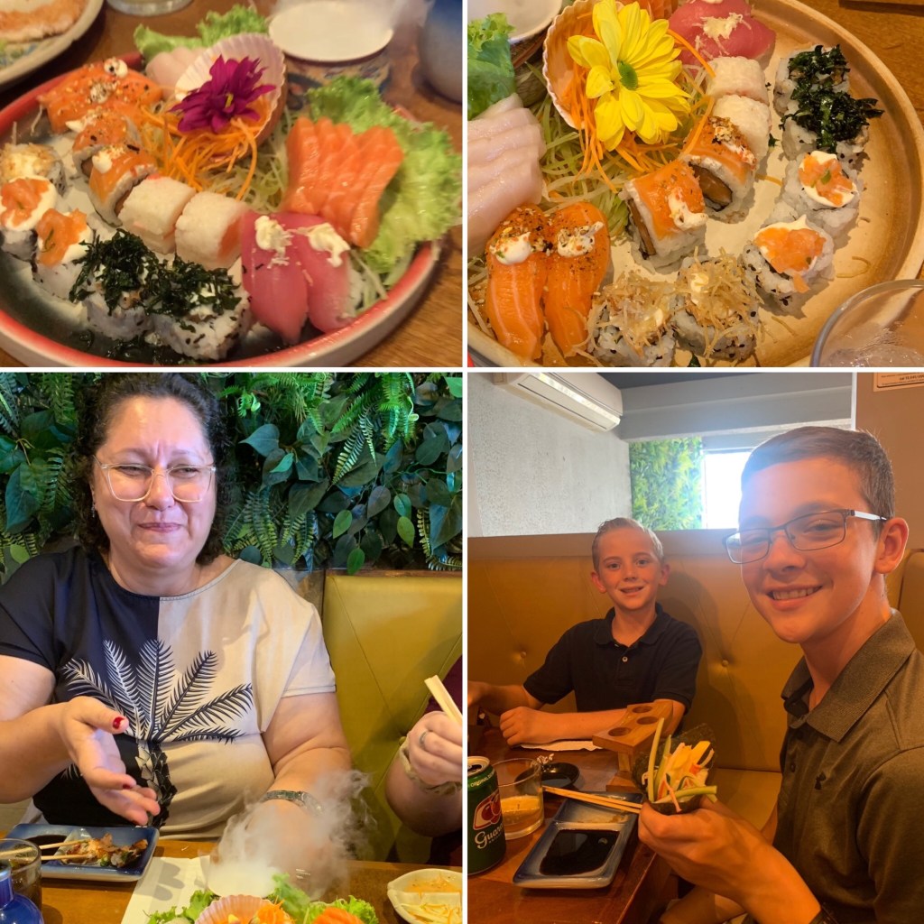 Tuck had chicken, like usual, but this time he ordered it with rice and “salad,” which he ate up. He said it was good but weird that his salad was warm. Ha! He ate cooked cabbage, carrots, and green onions and thought it was salad because that’s what Sarah called it. She’s like a big sister to them. I love it. After he was done eating it all, I told him what it was and he was like, “Yuck, I hate it.” Ha! This kid.