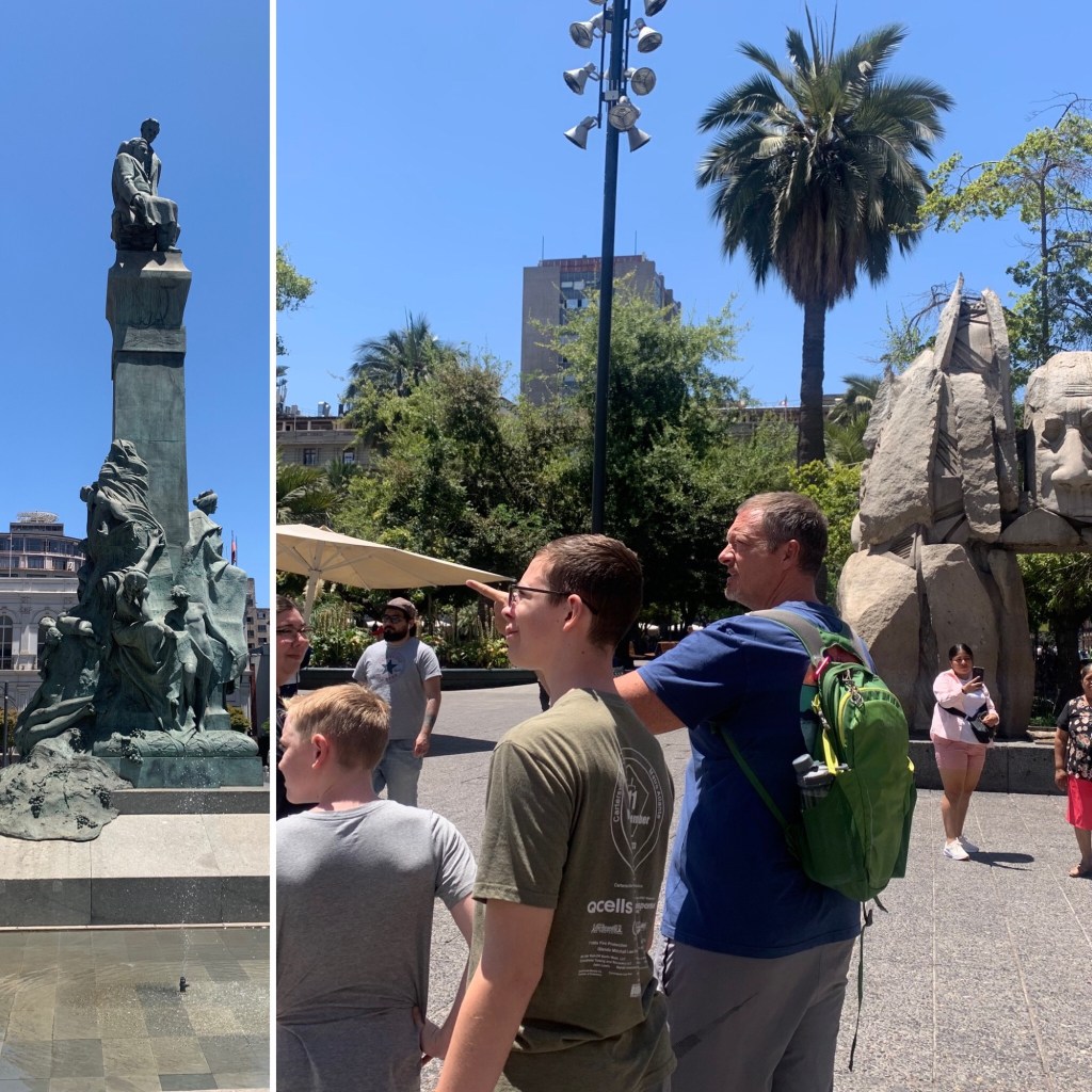 There are statues everywhere. Tuck is in front of the statue of Don Pedro de Valdivia, who was the founding father of Chile.