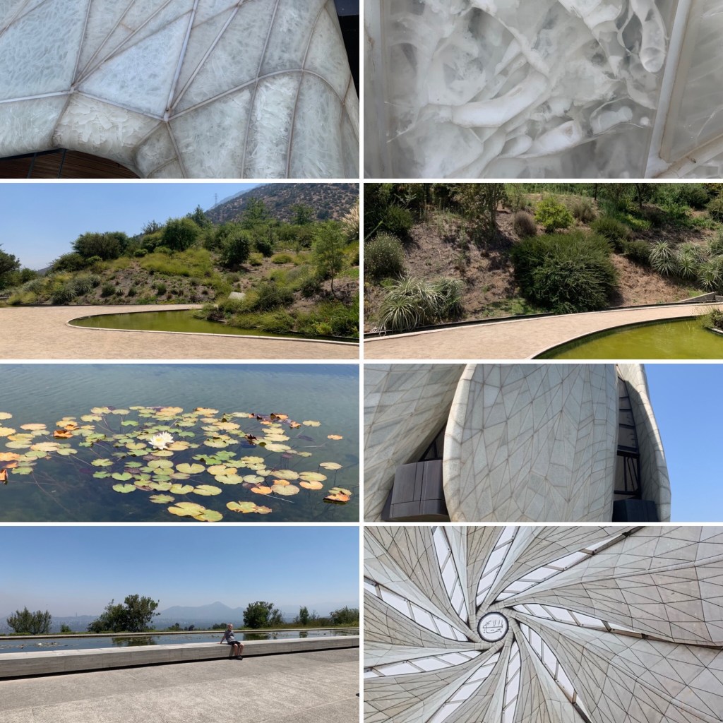 I was only intrigued by the amazing architecture. This $30 million, 14 year project, took six years to construct and being made of steel and aluminum the temple can withstand over a 10 point earthquake, as Chile is prone to frequent earthquakes. Due to the heat, the nine sides, or petals, are made of pieced Portuguese marble and cast glass. There are nine entrances, nine pathways swirling out from the temple center, and nine fountains.
