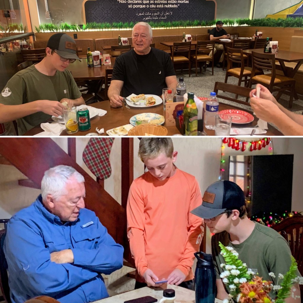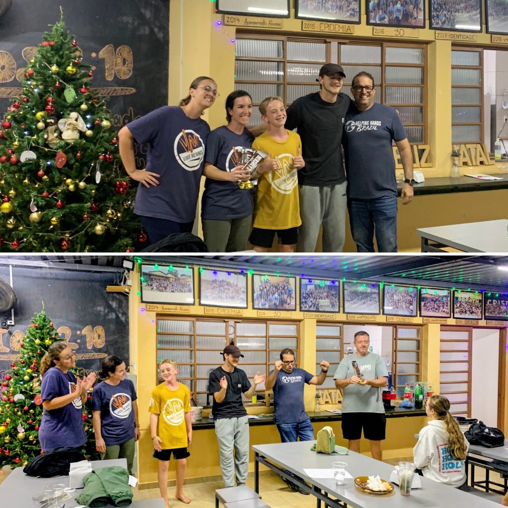 Monday evening, after a day of ministry, we had what I call family dinner. It is one evening where the visiting team and our staff (Brazilian and American) come together to get to know each other. This time we had a fun scavenger hunt. Trevor did an amazing job coming up with the idea and the clues. We even had a trophy of candy bars for the winners. Trev divided everyone into five teams, one member of the Hamilton family on each. Amelia’s team won. Tucker, Dawson, and Roberto were excited to be declared the winners. Aline was glad the running was over. I had Paul, Danny, Jose, and Marcella on my team. I just knew we were going to win. We took off like a lightning bolt. But sadly, much to my competitive spirit’s broken heart, we got one clue wrong and it messed us up.